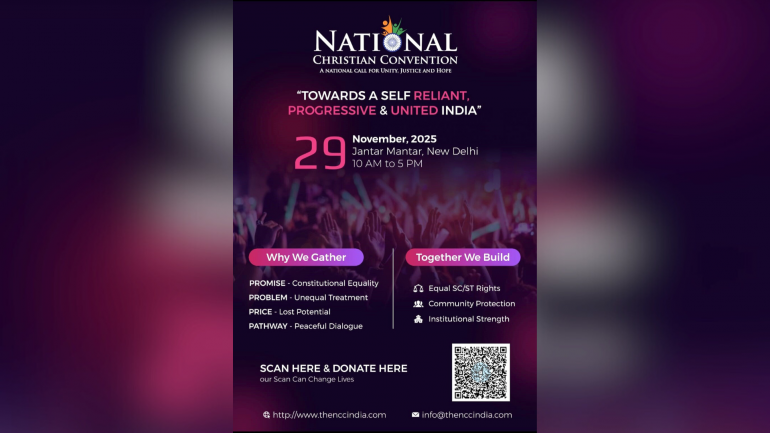 “एक आत्मनिर्भर, प्रोग्रेसिव और एकजुट भारत की ओर” थीम वाला एक नेशनल क्रिश्चियन कन्वेंशन 29 नवंबर, 2025 को नई दिल्ली के जंतर-मंतर पर होगा। इस इवेंट का मकसद भारत में क्रिश्चियन कम्युनिटी की बढ़ती चिंताओं की ओर सरकार का ध्यान खींचना है।