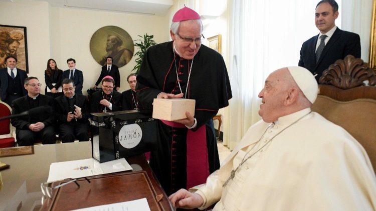 पोप ने मज़ाक में कहा, "जब मुझे बताया गया कि आप आ रहे हैं, तो मैं थोड़ा चिंतित था," उन्होंने याद करते हुए कहा कि उस अवसर के लिए उन्होंने जो संदेश भेजा था, उसमें उन्होंने उन्हें "पागल" कहा था, "और मुझे आश्चर्य हुआ कि क्या इसीलिए आप मुझसे मिलने के लिए इतने उत्सुक थे।" "लेकिन मोनसिन्योर सैज़ मेनेसेस ने मुझे बताया कि यह पहल एक अनुग्रह रही है जिसकी गूँज अभी भी सुनी जा रही है," उन्होंने विनोदी भाव में कहा, "और इसलिए मैं अधिक सहज महसूस कर रहा हूँ।" अपनी टिप्पणी में, संत पापा ने उन्हें अपने कार्यक्रम को प्रशंसा की प्रार्थना के रूप में जीने के लिए दिए गए निमंत्रण को याद किया "जो ईश्वर और हमारे भाइयों और बहनों की ओर तीर्थयात्रा की तरह हमारी सांसारिक यात्रा के साथ है" और उनसे "इतने अधिक प्रेम के साक्षी बनने के लिए कहा कि यह "पागल" लग सकता है, प्यार से पागल।"