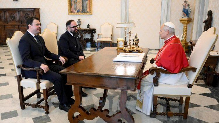 आज सुबह, 12 जनवरी को, पोप लियो 14वें ने वाटिकन के प्रेरितिक भवन में संत मरीनो गणराज्य के राज्य-संरक्षकों, मत्तेओ रॉसी और लोरेंजो बुगली से मुलाकात की, फिर वे वाटिकन राज्य सचिव कार्डिनल पिएत्रो पारोलिन से मिले, जिनके साथ विदेश सचिव महाधर्माध्यक्ष पॉल रिचर्ड गैलाघर भी थे।